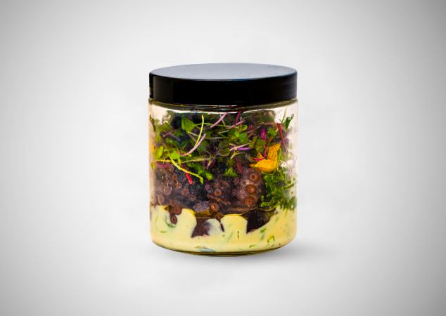 İstanbul’dan esinlendiği kavanozuyla şefimiz, deniz ürünleri kullanarak yarattığı büyülü bir lezzet keşfine davet ediyor. 34 kavanozunda lakerda ve ahtapot lokmalarına, sebze suyu ile hazırlanan beyaz fasulye püresi ve deniz börülcesi eşlik ediyor. Şef Ali Ronay, bu sıra dışı tarifinde İstanbul’un maviliklerini taze lezzetlerle hissettiriyor.